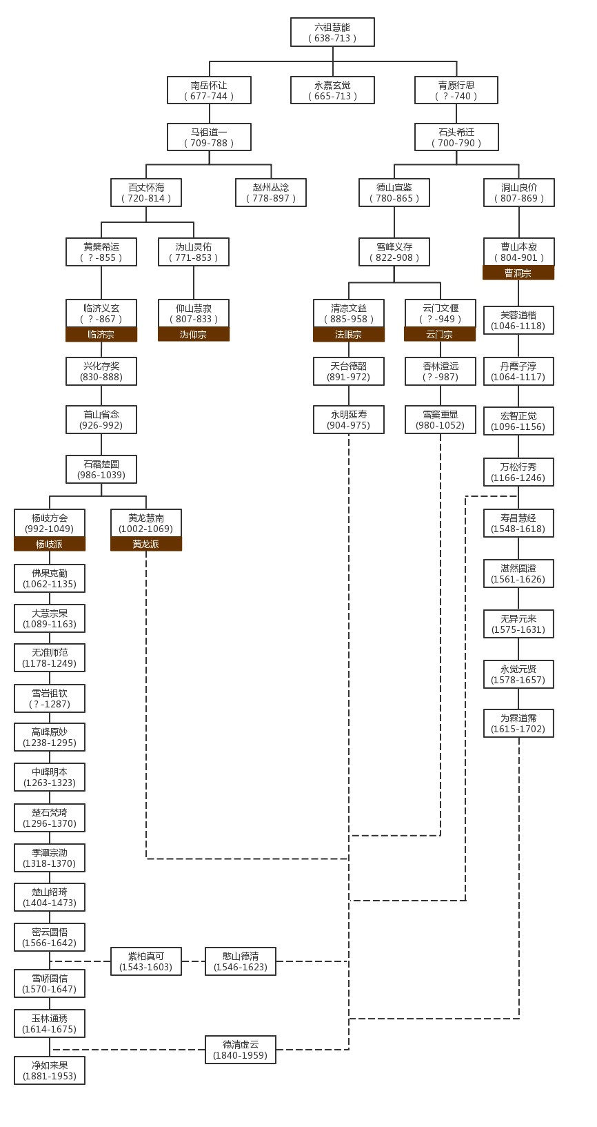 黄龙派:慧南创立。因其住黄龙山(在今江西南昌市)而得名。法门为“道不假修,但莫污染;禅不假学,贵在息心”。